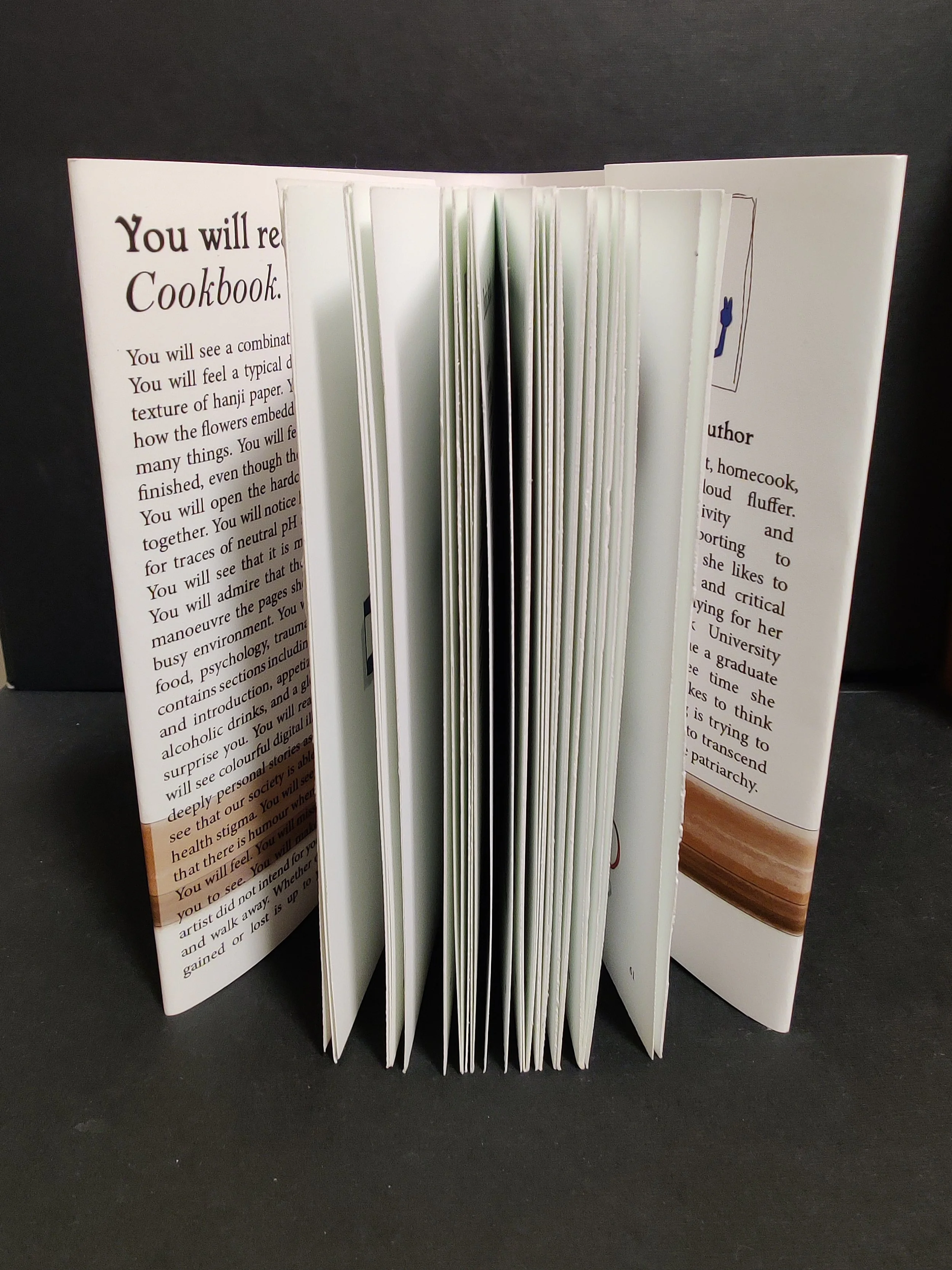 You will see photos of an artist’s book, a combination of analog and digital technology. You will find out that it is made up of 64 pages that lay flat. You will realize that it explores psychology, trauma, and expression. You will read sample pages of memories disguised as recipes. You will be able to identify personal stories and over-generalizations. You will see that our society is able-ist. You will see that sometimes it is difficult to live but that there is humour in living. You will miss something that the artist intended for you to see and make a connection to something that the artist did not intend for you to make.
