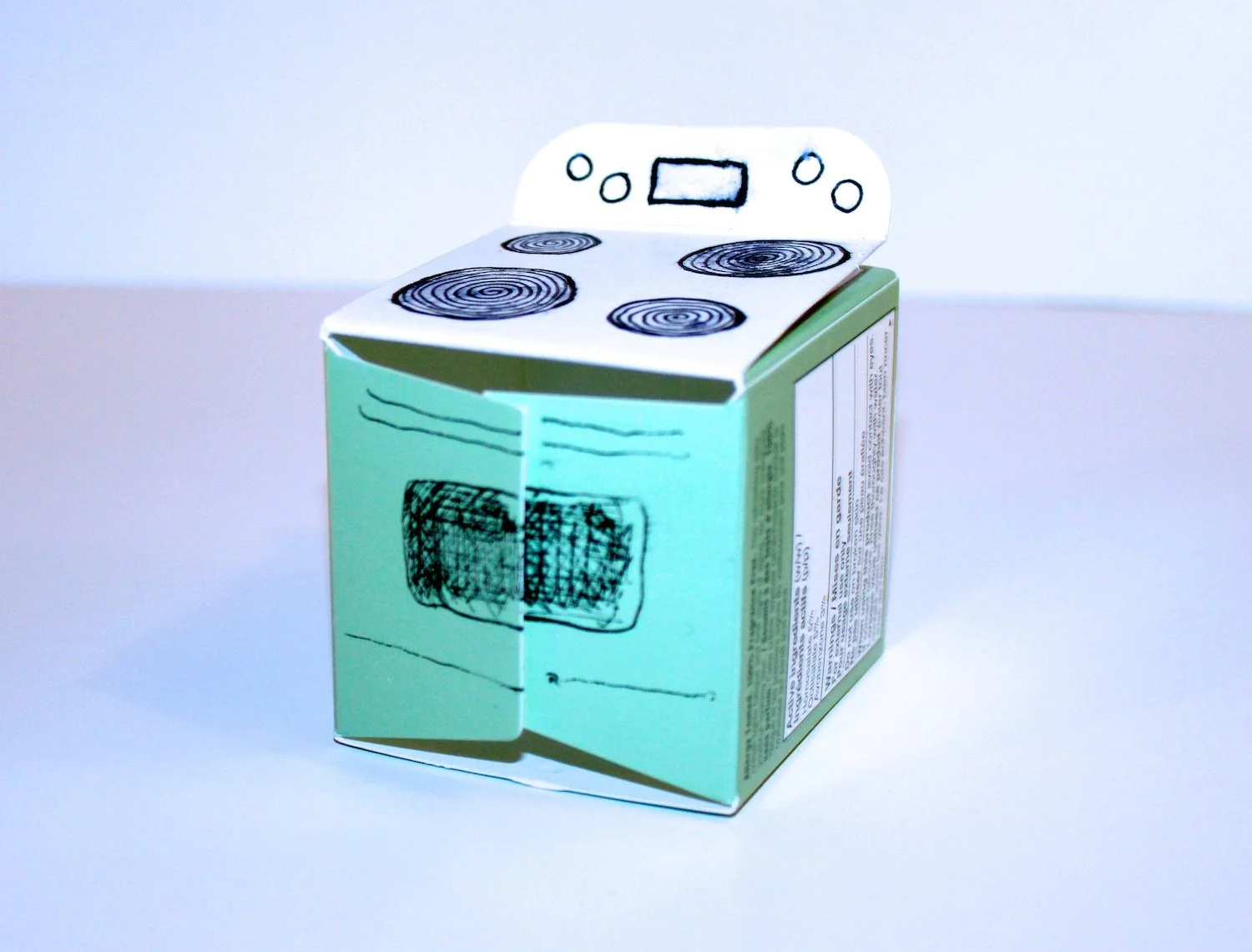 LISA_SUBRYAN: Recycled Stove, 2021, 2.5’’ x 2.5’’, Pencil and Pen on a box