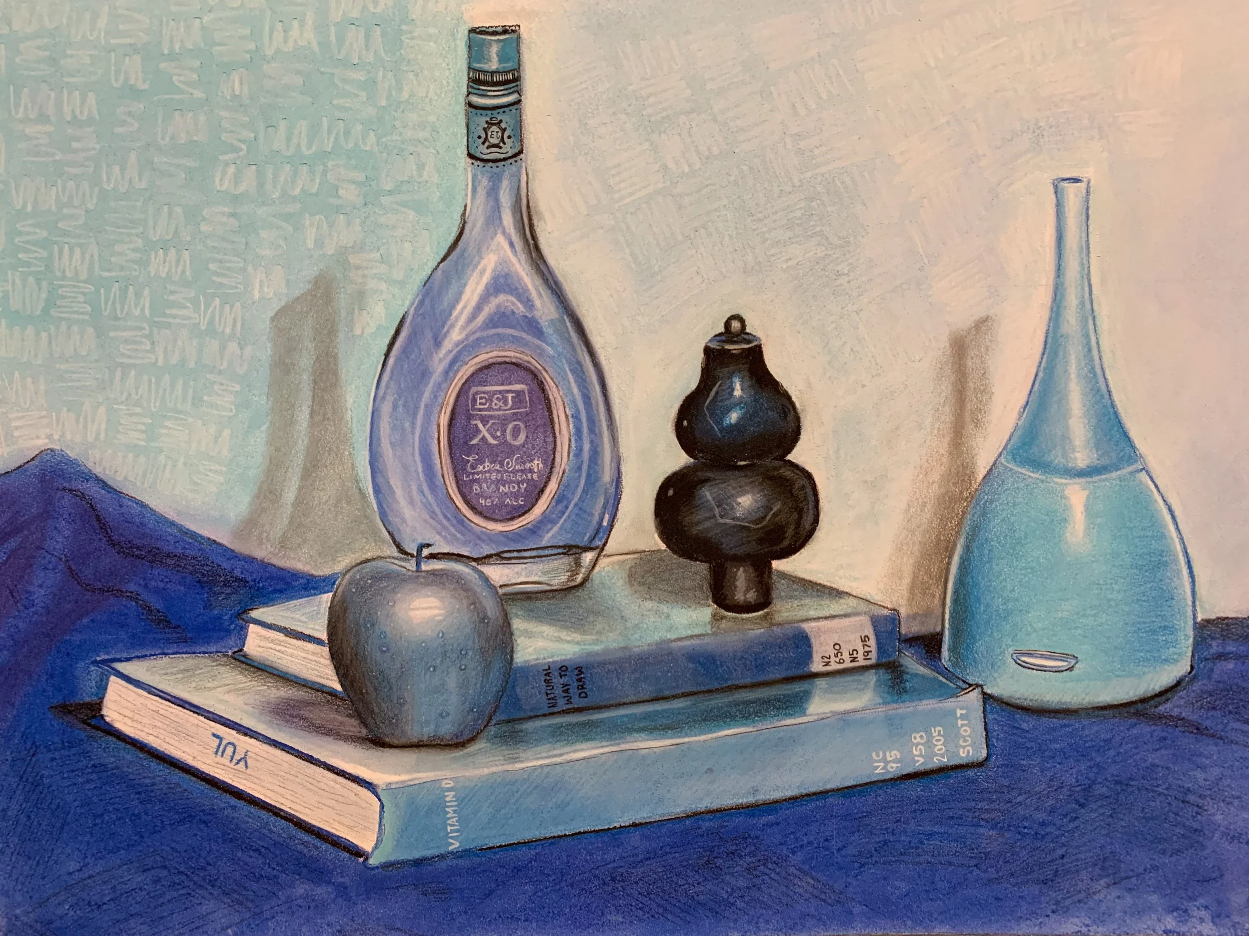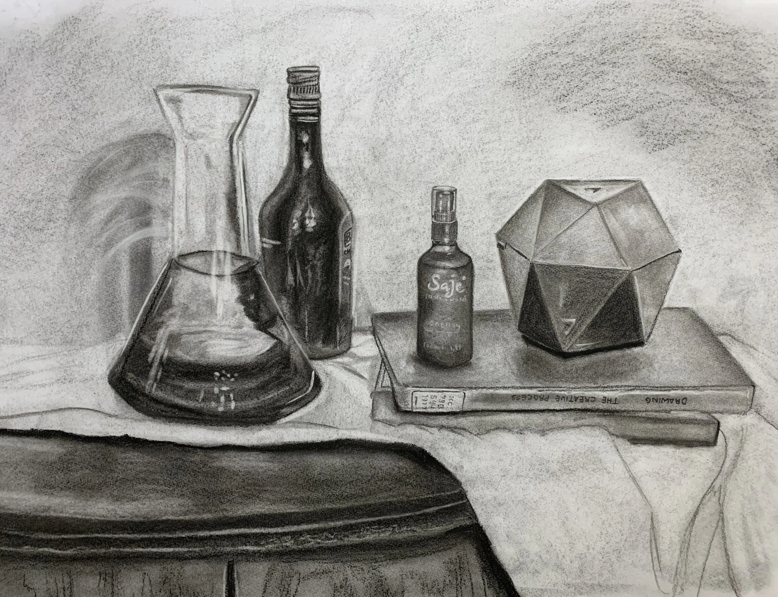 XIA WENJIN, 4, ORDINARY OBJECT, CHARCOAL ON PAPER, 18 x 24, 2022. This is a still life drawing with a focus on household objects on paper using charcoal pencil. Through shading techniques of realistic lighting, it helps us better at creating shapes and building three-dimensional forms.