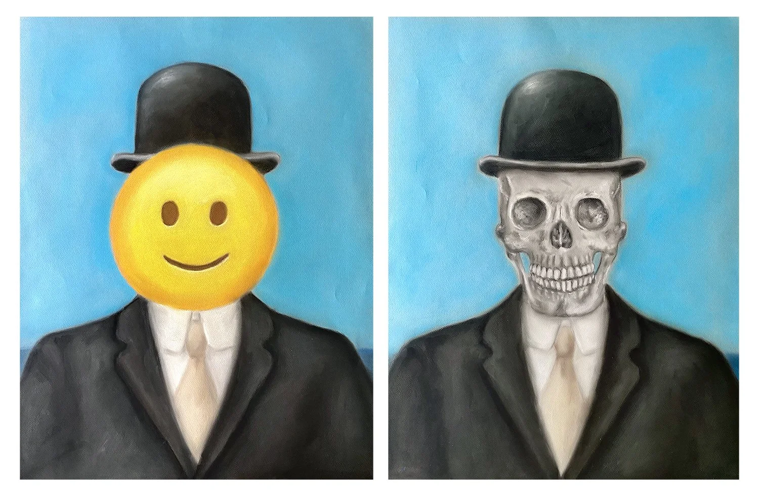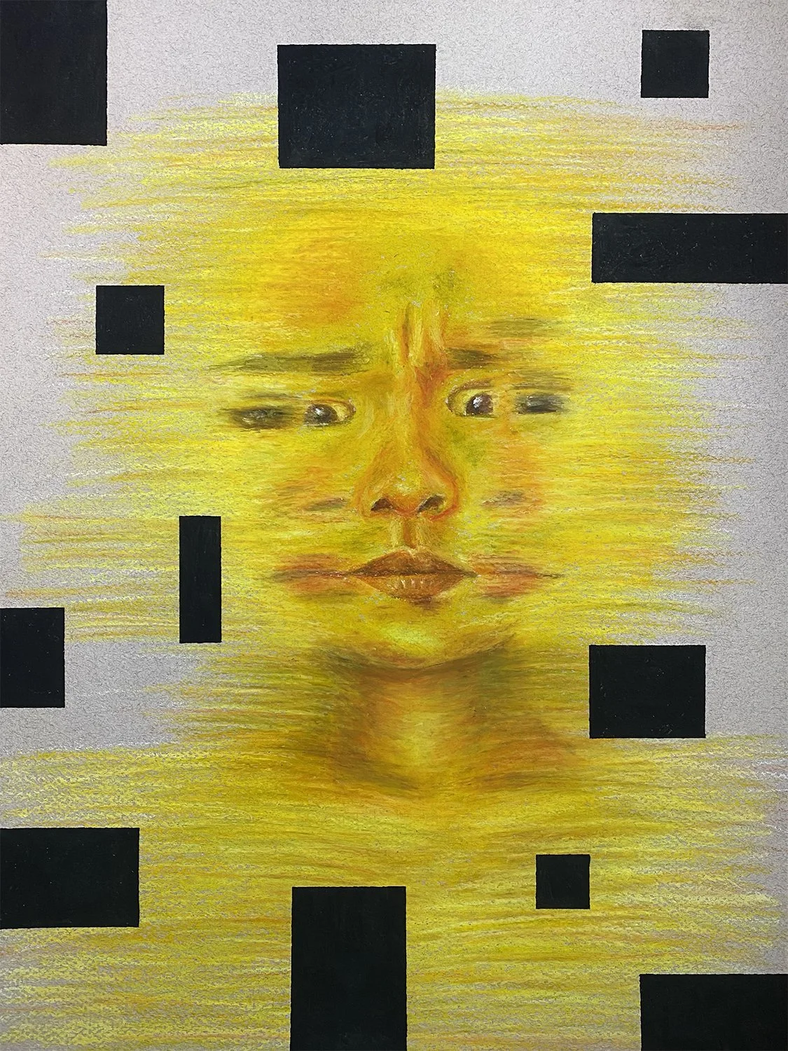 DAYAN TORRES FLEITES, 3, FACADE, PASTEL, MARKER, WATERCOLOUR, ACRYLIC, PENCIL CRAYON ON PAPER, 18x24, 2022. Façade is reminiscent of a magazine cover and portrays the struggles masked by a social media presence.
