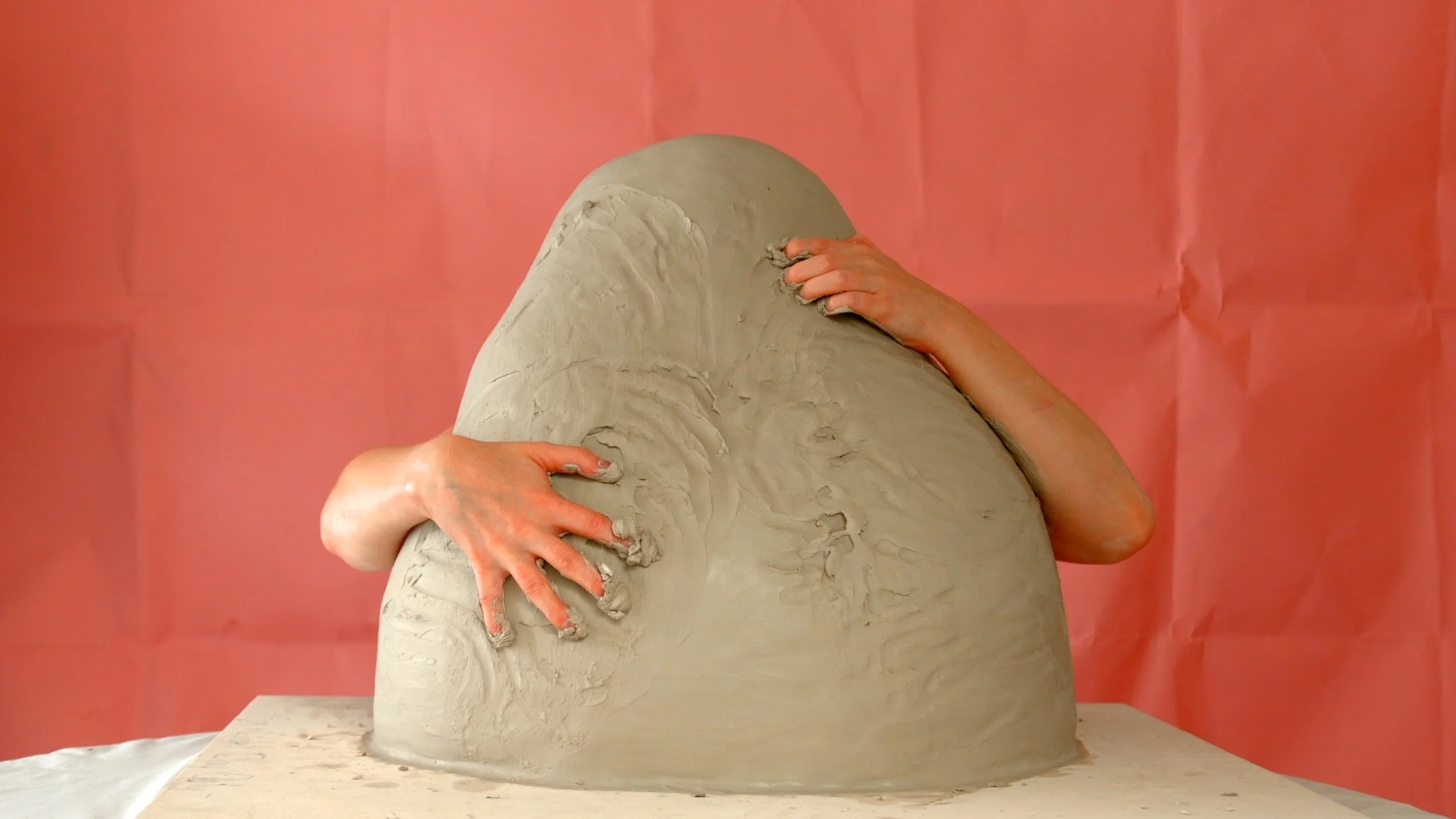 Two arms stretch out from behind a large clay body. They reach around the form barely able to wrap around at the widest part. Initially the touch is gentle - hands gliding on the wet surface - rubbing up and down. Then slowly the touch becomes more activated - it shifts from gliding, to scratching, to clawing. Evidence of the embrace is carved out of clay - mapping the marks of body on body. As the two hands grasp and paw, new grooves cover older grooves burying them beneath the other.