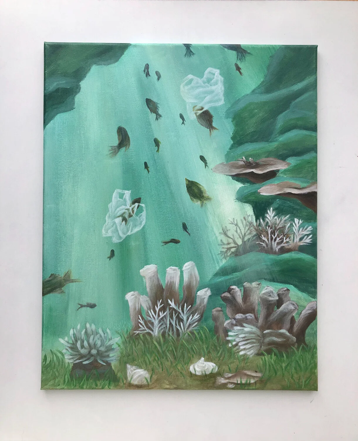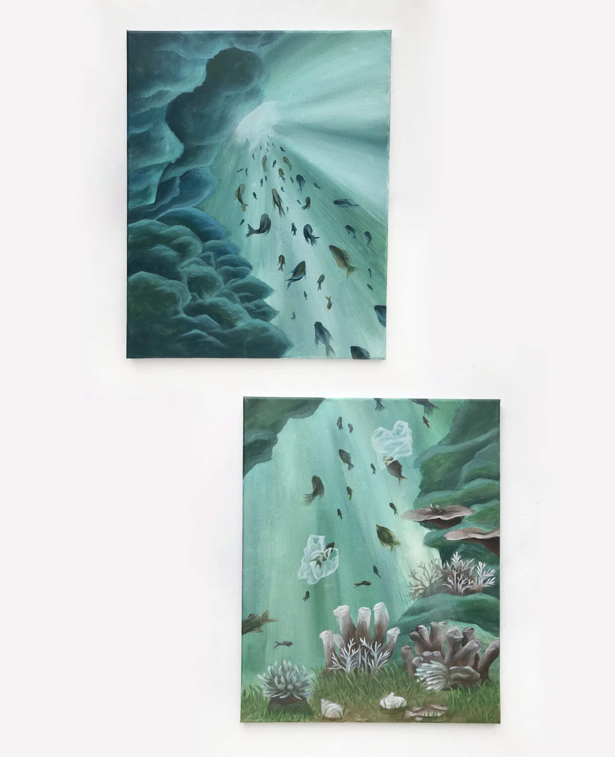 SUSANNA LEE, 5TH YEAR, KEEP SWIMMING, ACRYLIC PAINT, 16” X 20”, 2021 - Drawing upon romanticized landscapes, such as those portrayed in the media, this painting features an uninhabitable underwater scenery. Sea creatures escape and swim upwards to the painting above.