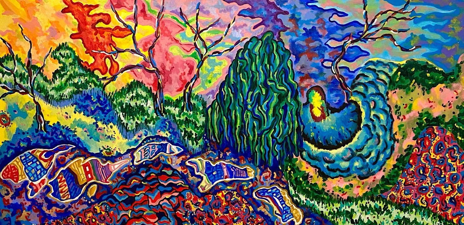 NICOLE DIMT, 4TH YEAR, CHLOROPHYLL DREAMS, ACRYLIC ON CANVAS, 24” X 48”, 2021 - This work looks at Canadian-style landscapes, psychedelic visuals, and the sublime. This work was inspired by the spirituality which can arise from one’s personal relationship with nature.