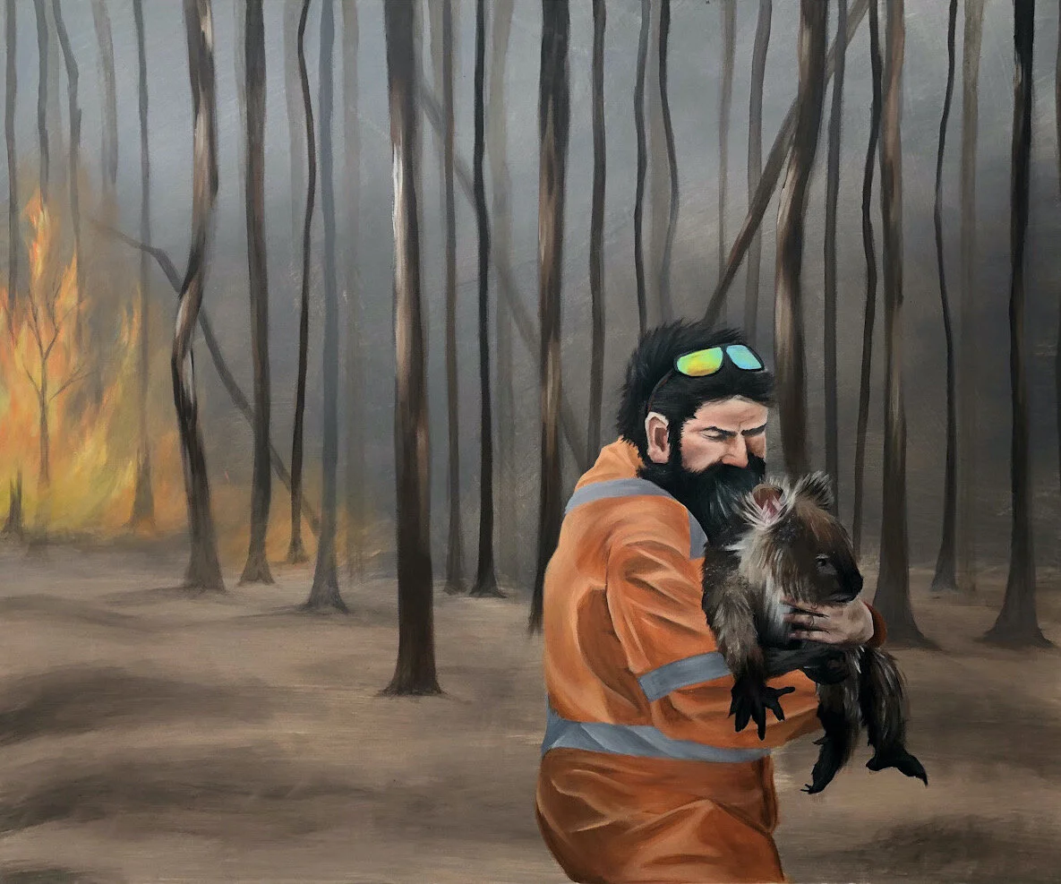 SUSANNA LEE, YEAR 5, WARMTH, ACRYLIC PAINT, 30” X 36”, 2021 - Tackling ideas of environmental issues, this painting calls back to the unfortunate wildfires in Australia of 2020. With destroyed foliage, burnt homes, and injured wildlife creatures, Warmth showcases a fire slowly trailing behind a firefighter who safely carries out a koala.