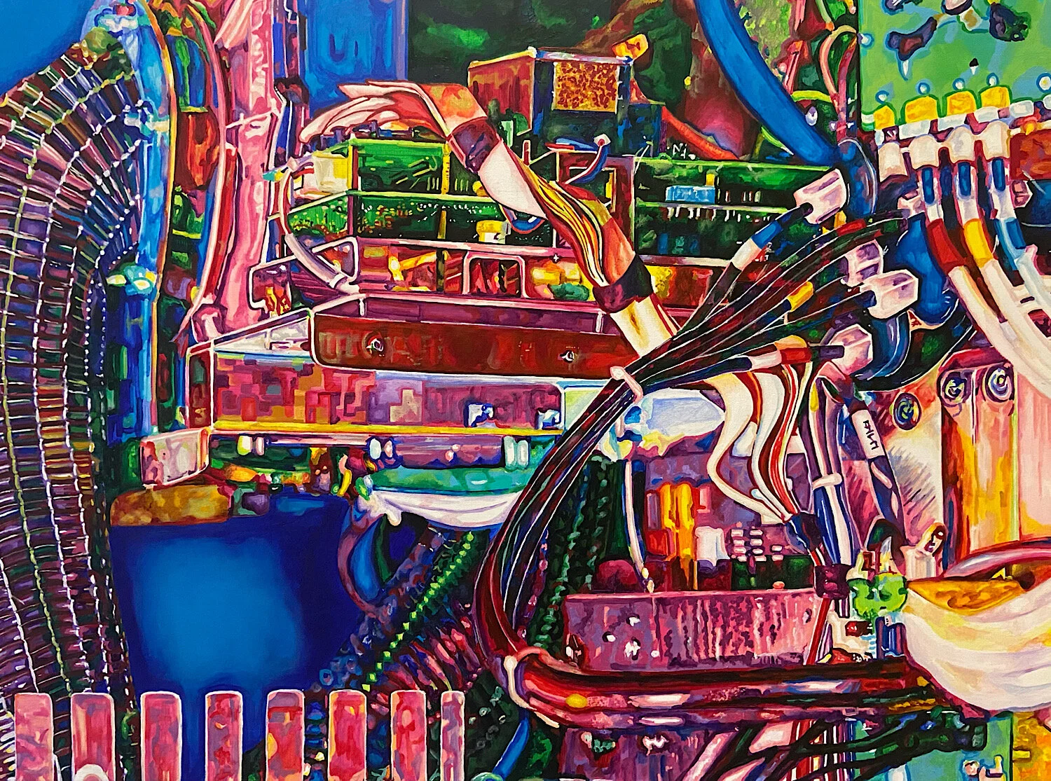 NICOLE DIMT, 4TH YEAR, CANDY WIRES, ACRYLIC ON CANVAS, 40” X 30”, 2021 - This piece examines the world of computer motherboards, exploring the relationship between physical hardware and the digital world.