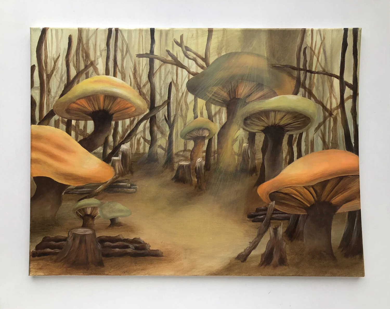 SUSANNA LEE, 5TH YEAR, MADNESS, ACRYLIC PAINT, 18” X 24”, 2020 - References the Disney movie, Alice In Wonderland, by juxtaposing the magical mushroom scenery with this deforested, desolate forest. Criticizing romanticized landscapes visible in the film, Madness calls viewers to consider the environment they live in.