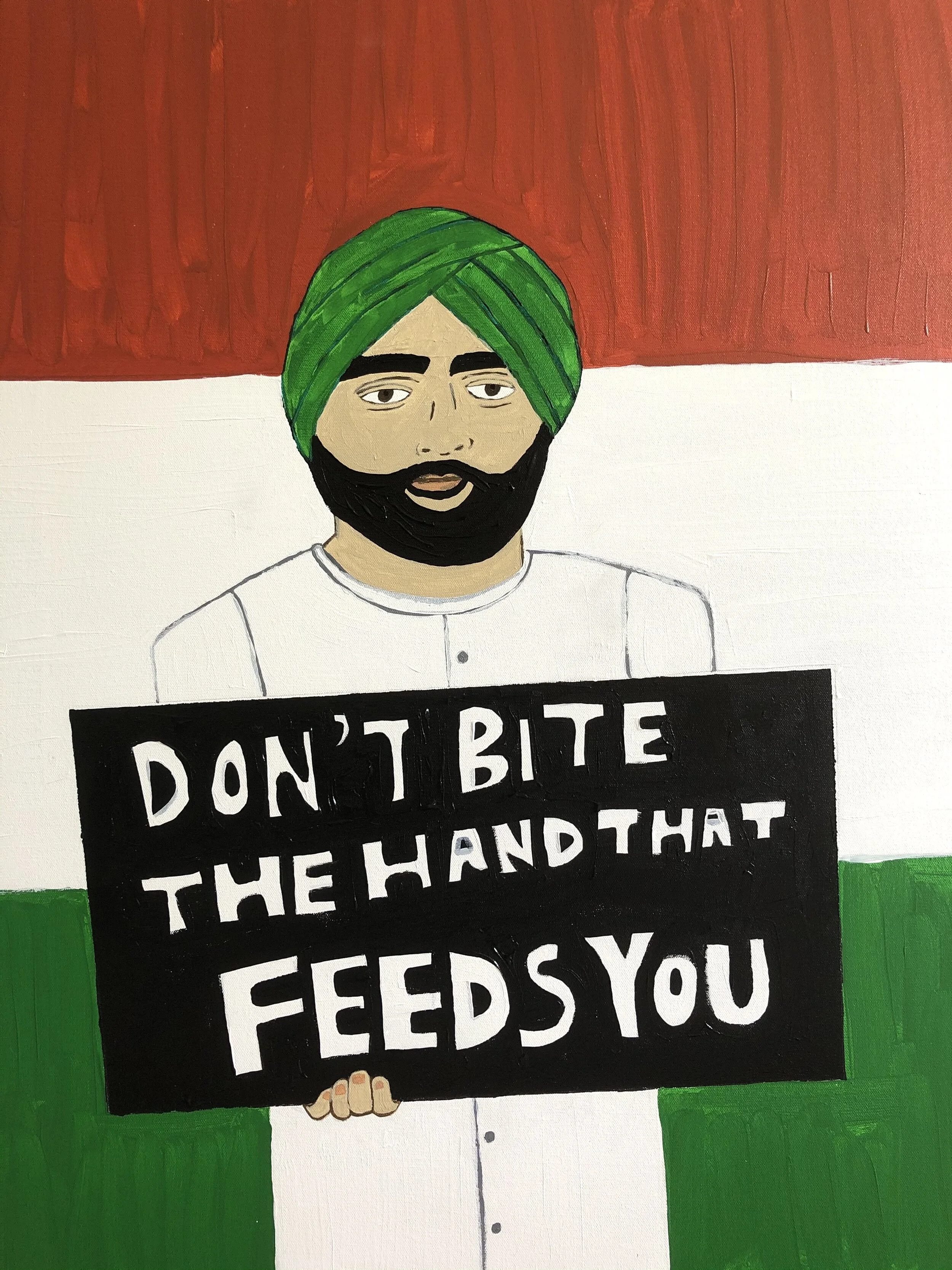 INSIYA PATEL, 3RD YEAR, DON’T BITE THE HAND THAT FEEDS YOU, ACRYLIC ON CANVAS, 30” X 24”, 2021 - A painting to bring awareness to the new agricultural laws instigated in India by the government, and how these laws adversely affect and disrespect the farmers of the country; the ones who provide food to the country.