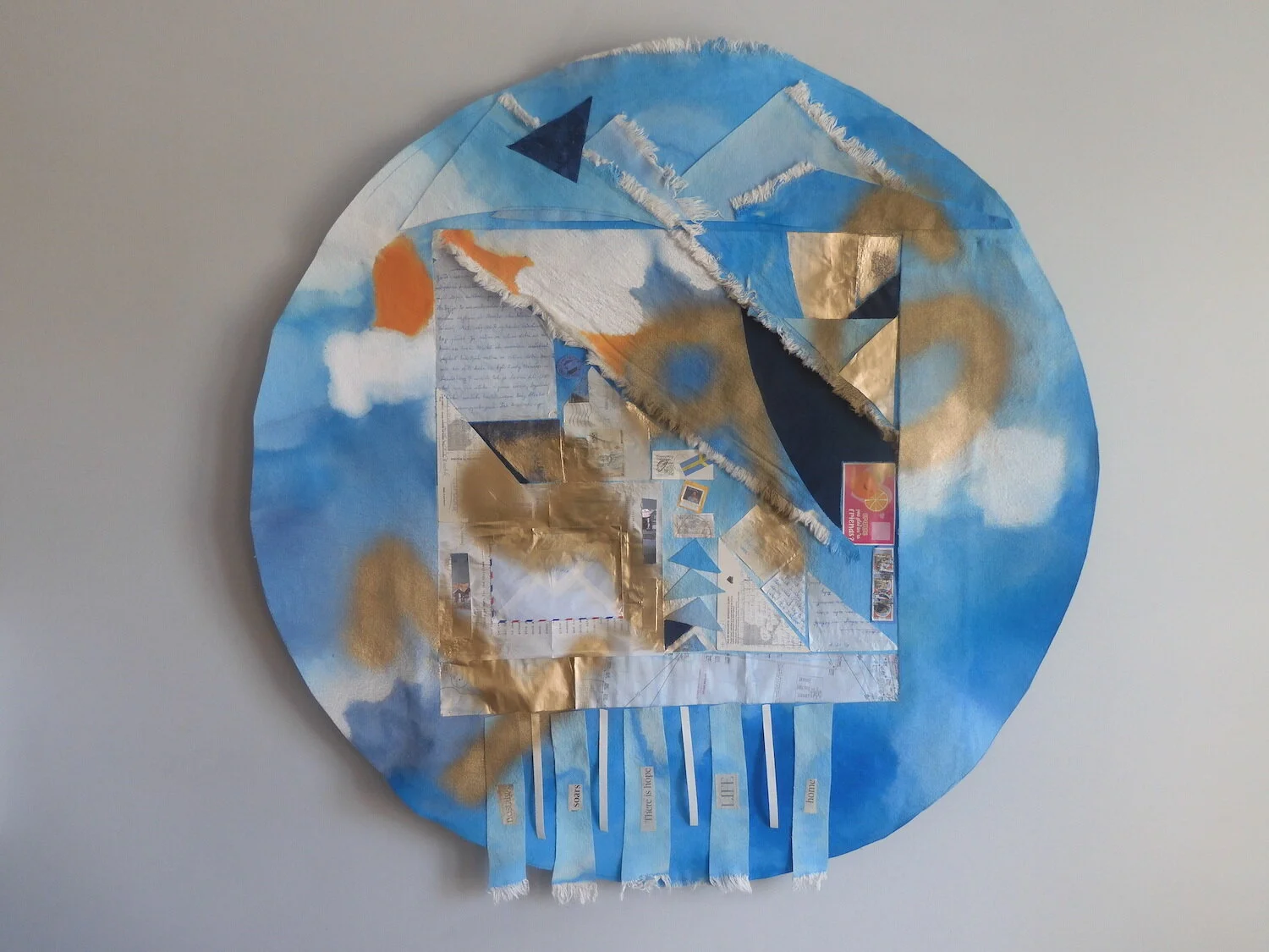 KAROLINA BAKER, 2ND YEAR, AIR 2, MIXED MEDIA, 40” DIAMETER, 2021 - This piece was created out of an initial stain painting project on a 3’x4’ piece of raw canvas with the theme of air. The aim was to deconstruct the initial canvas and recreate a new piece, reinforcing the original theme.