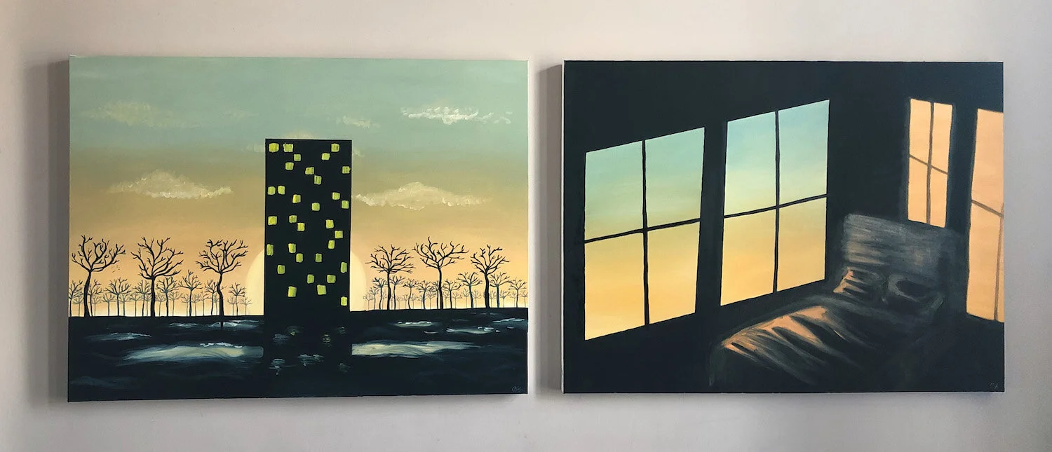 CELISHA HOSEIN, 6TH YEAR, SUNSET, OIL AND ACRYLIC ON CANVAS, 30” X 40” EACH, 2020 - A commentary on how the human world is taking over nature.