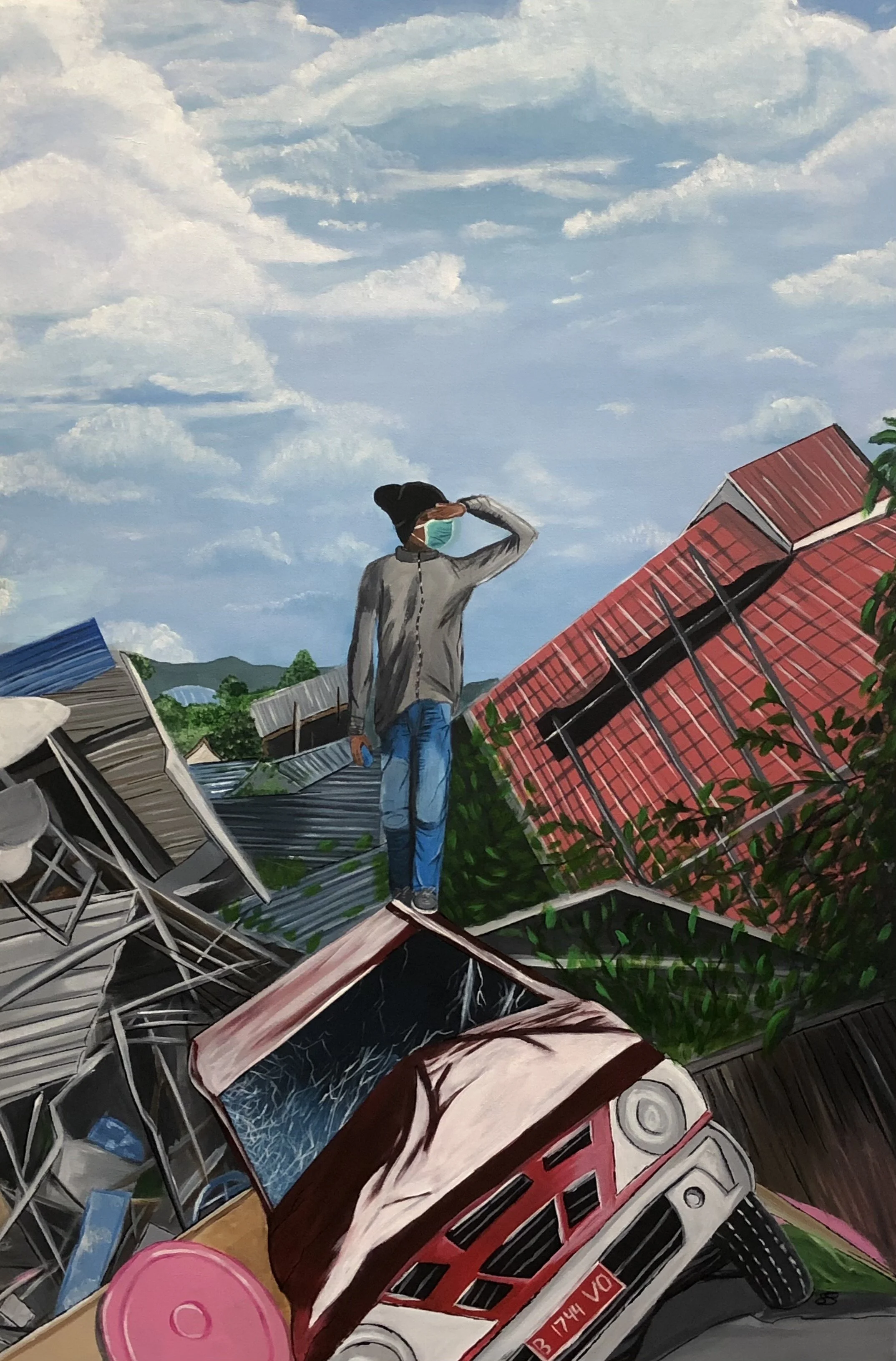 SASHA NANDAN-SUTHERLAND, 5TH YEAR, THE AFTERMATH, ACRYLIC PAINT, 36” X 24”, 2021 - This painting illustrates the aftermath of an earthquake and tsunami that hit Indonesia in 2018. It shows a man standing on a crushed car surrounded by debris, in search of anyone that survived these natural disasters.