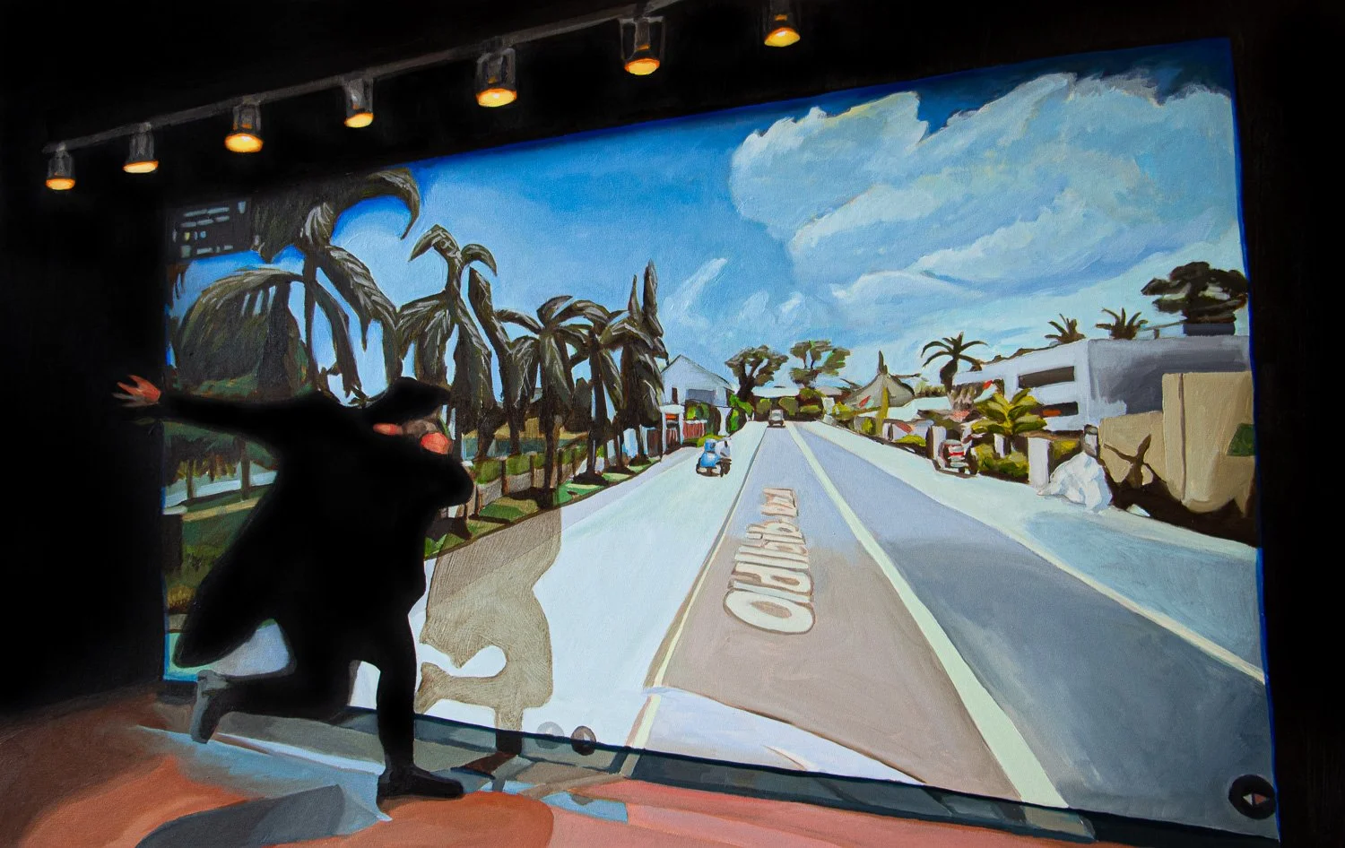 REVILL VILLANUEVA, 4, I WANNA GO HOME, OIL ON CANVAS, 30” X 48”, 2022. This depicts is the artist’s desire to return back to his childhood place in the Philippines after leaving the country 10 years ago. With the restrictions of the COVID-19 pandemic, the artist immerses himself in a projection of a street view of Tiring, Cabatuan, Iloilo from Google Earth to relive his childhood memories.