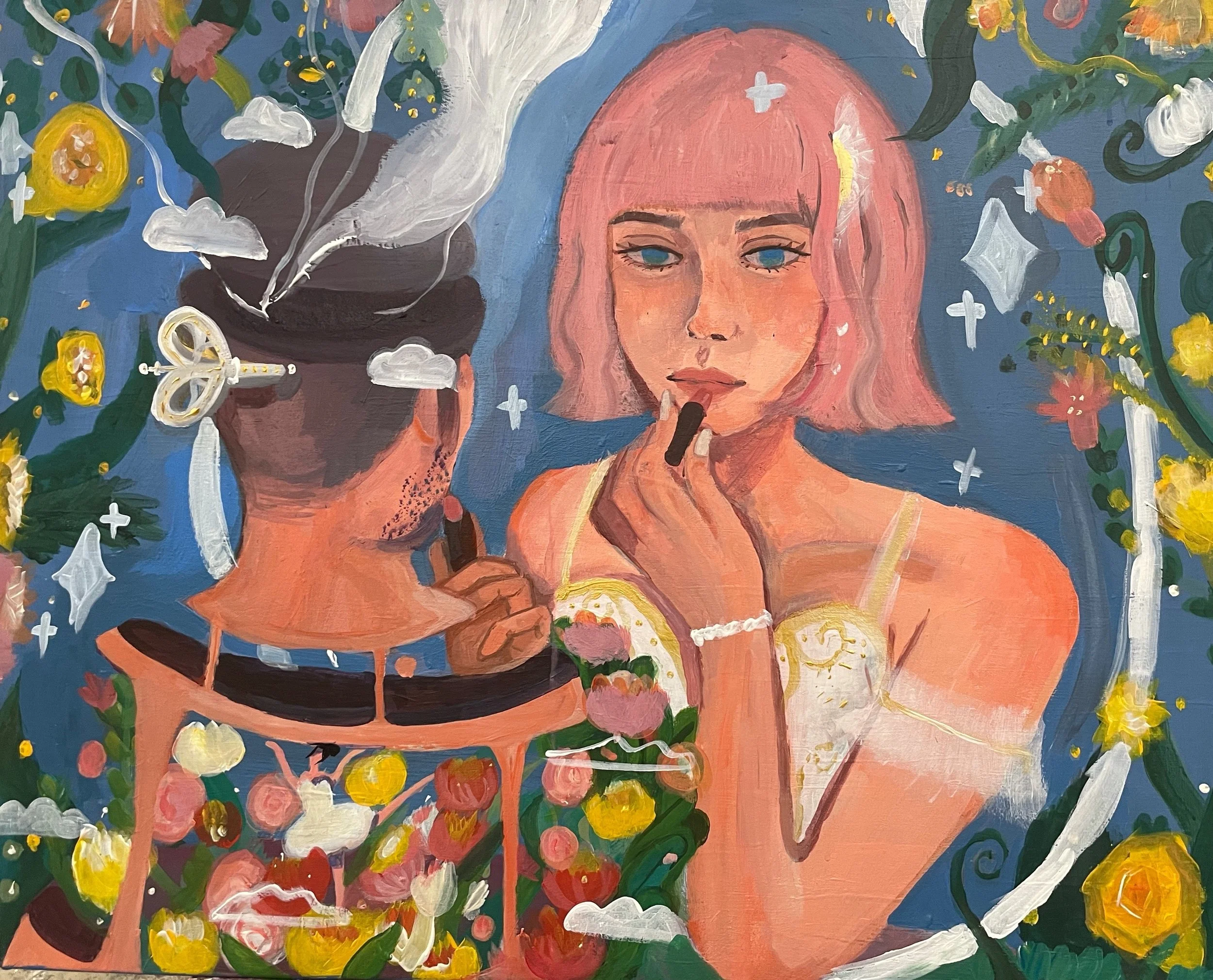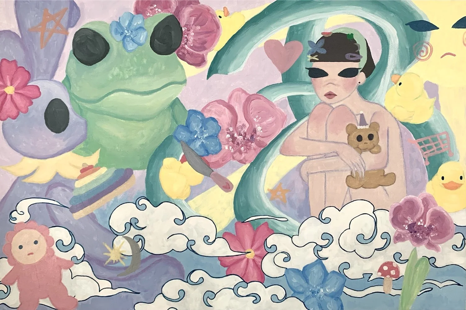 EILEEN JEN, 4, ADOLESCENCE, ACRYLIC ON CANVAS, 24x36, 2022, Adolescence examines the confinements of gender roles imposed in childhood and a sense of forced maturity as a result.