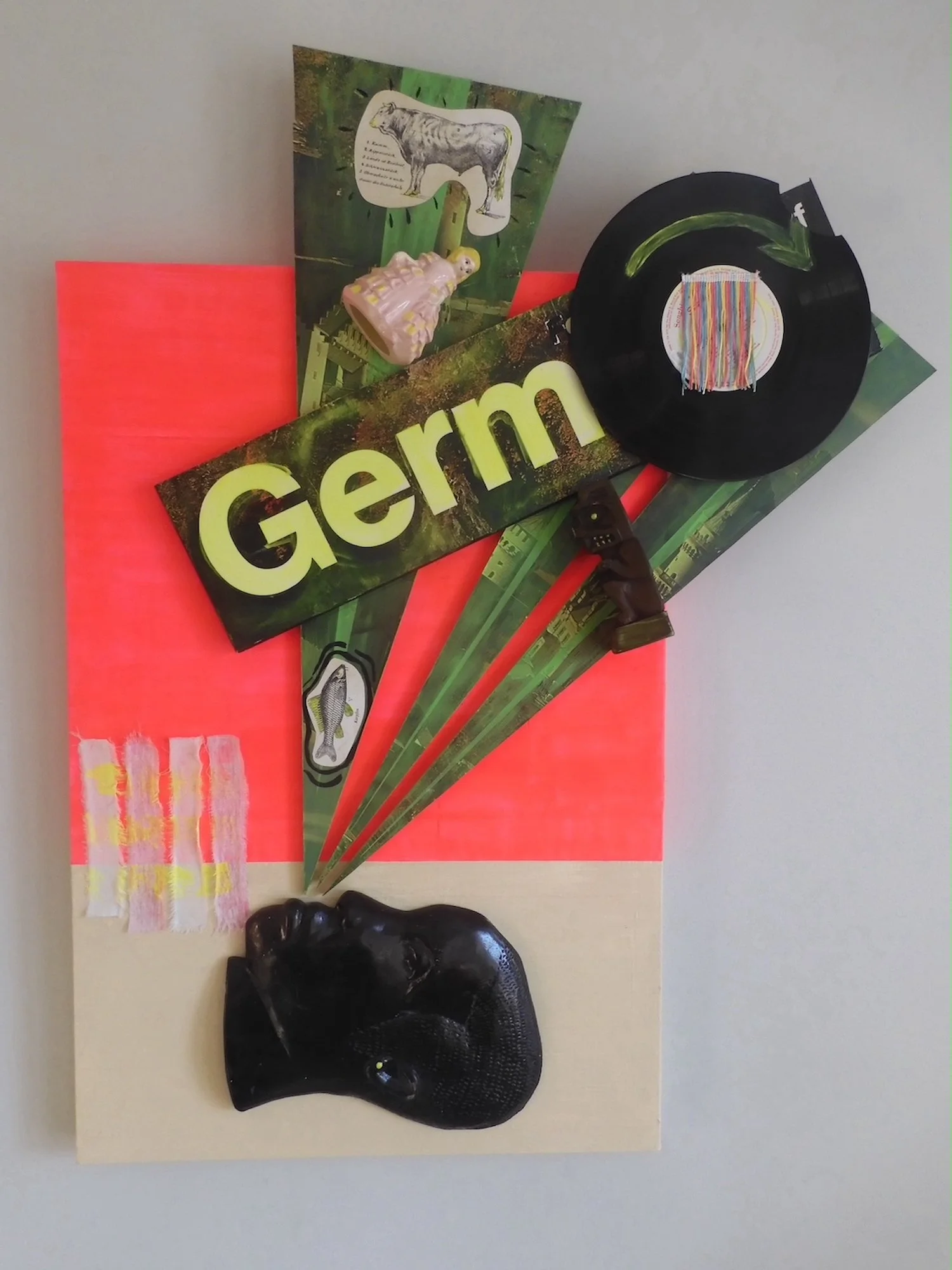 KAROLINA BAKER, 3, LAST MAN ON THE TOTEM POLE, ACRYLIC ON CANVAS WITH FOUND OBJECTS, 29”X36”, 2021. This assemblage was created with the influence of world news during 2021: food shortages, environmental destruction, and the international community’s acknowledgement of ethnic, gender and race issues.