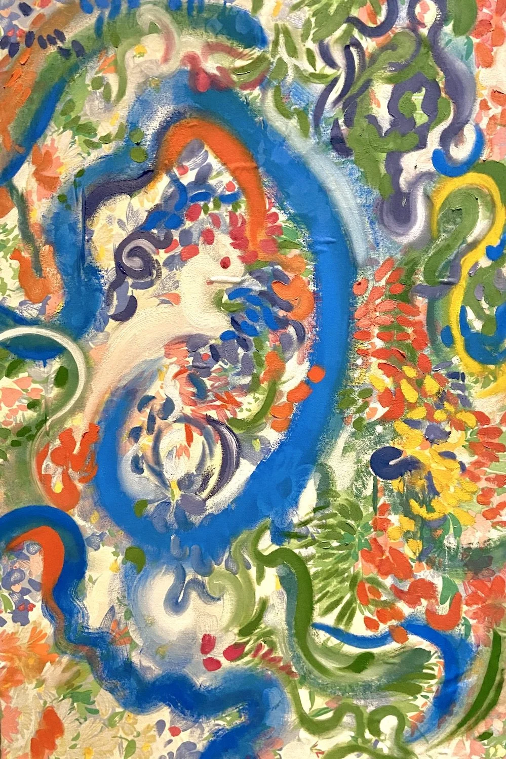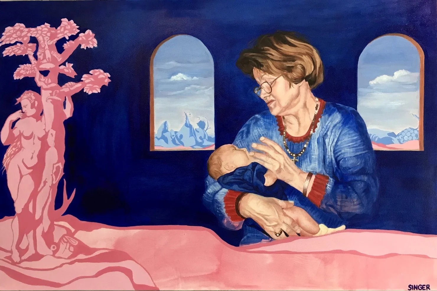 GENEVIEVE SINGER, 5, MEMORIES FROM THE GARDEN (IN ULTRAMARINE), OIL AND ACRYLIC ON CANVAS, 24X36, 2022. To form a personal relationship, I return to my grandmother and her religion. This piece is inspired by my only memory of my grandmother-her garden, and my namesake, which connects to Eve in the Garden of Eden, and traditional depictions of the Madonna and Child.