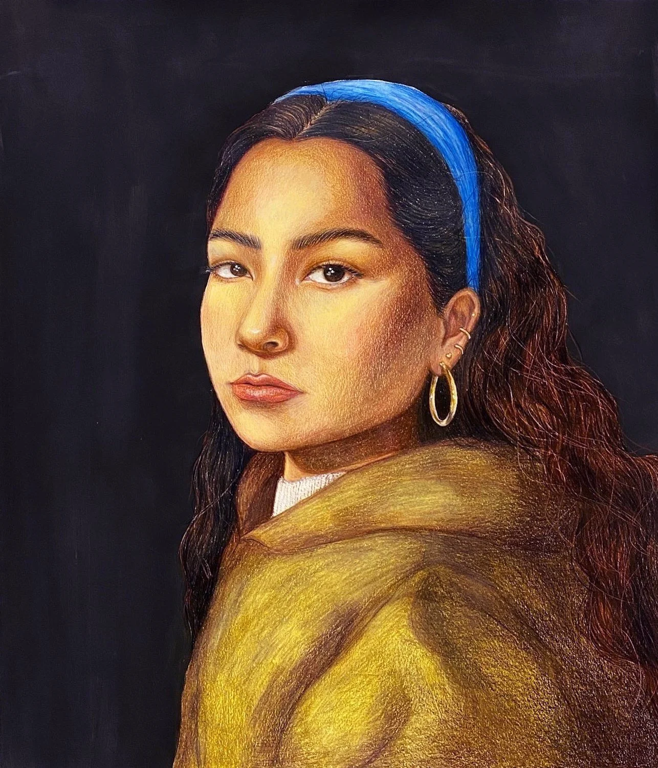 JESSALYNN RAMGOOLAM, 4, GIRL WITH THE HOOP EARRING, COLOURED PENCILS & GOUACHE ON PAPER, 17X13, 2022.