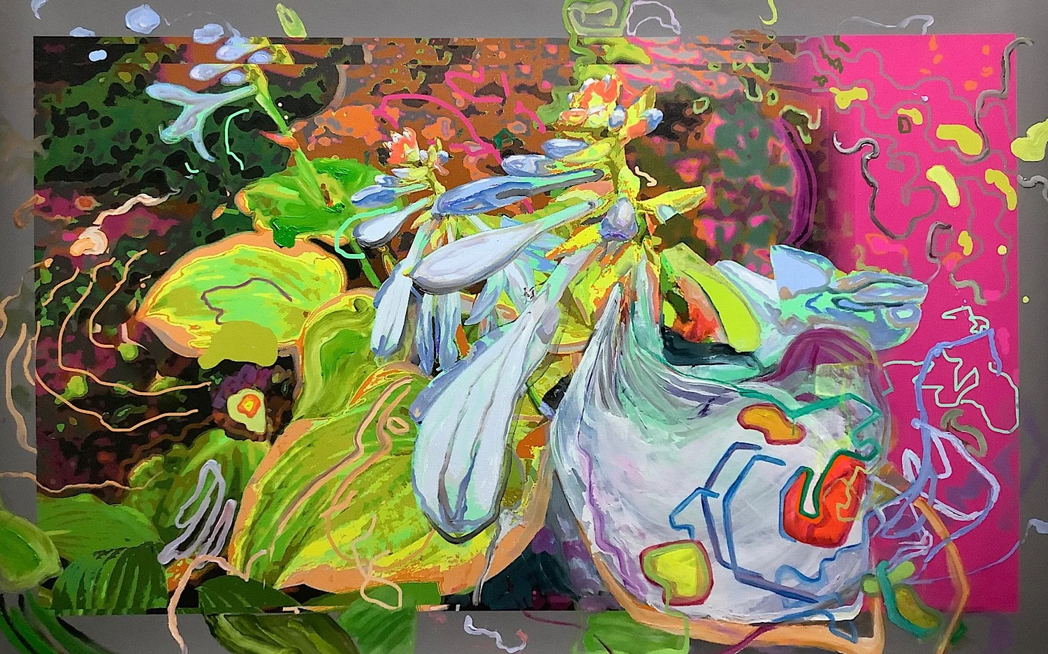 TALINE KAVOUKIAN, 3, GARDEN PARTY, OIL, ACRYLIC AND FLASHE ON DIGITAL PRINT CANVAS 35.5 x57, 2022.