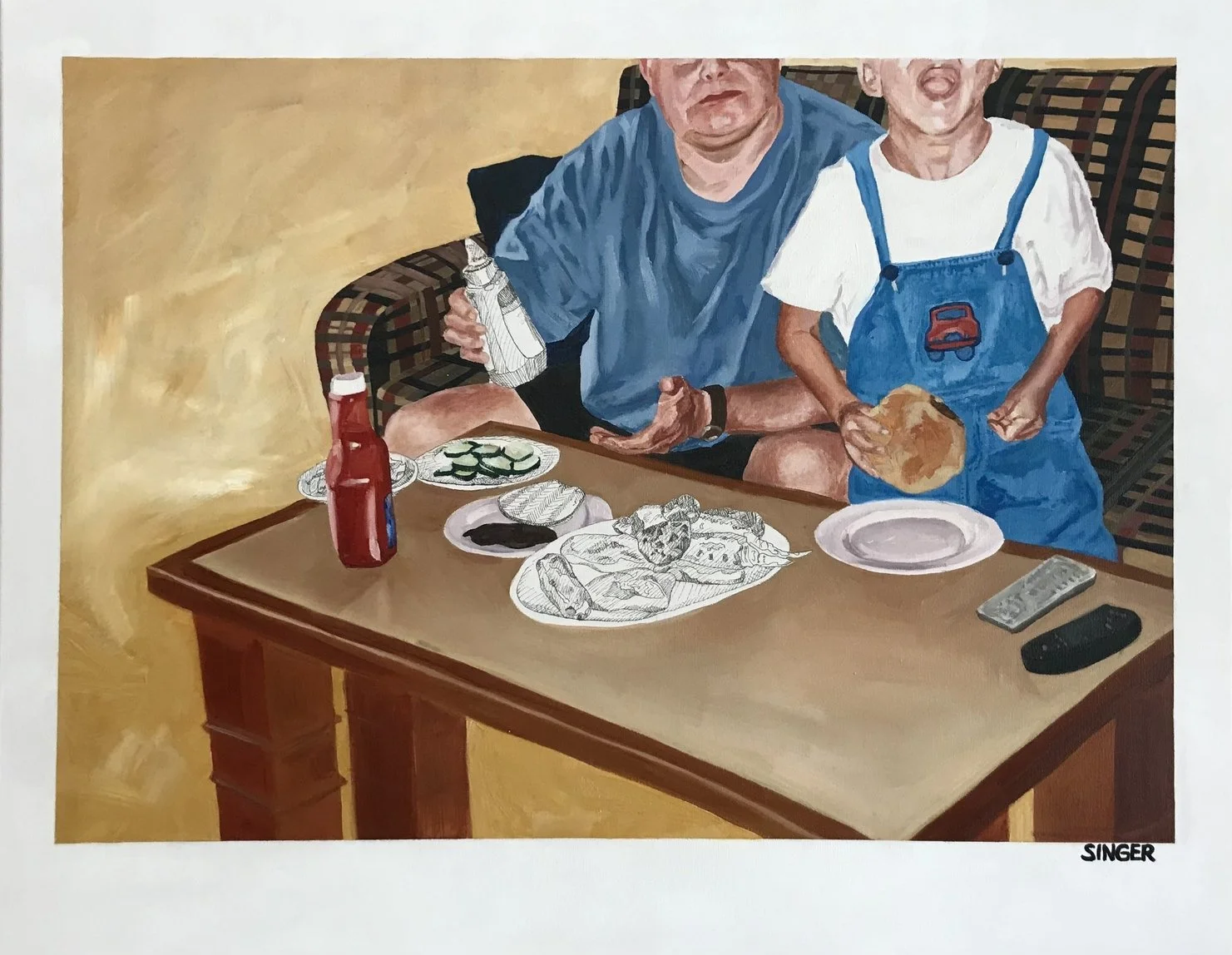 GENEVIEVE SINGER, 5, HOME INVASION: THE BURGER EATERS, OIL AND INK ON CANVAS, 22x28, 2021. This painting is inspired by a photo album of strangers found at thrift store. Here, I expand my understanding of memory, home, the mundane, and the uncanny as I navigate intimate moments of an anonymous family.