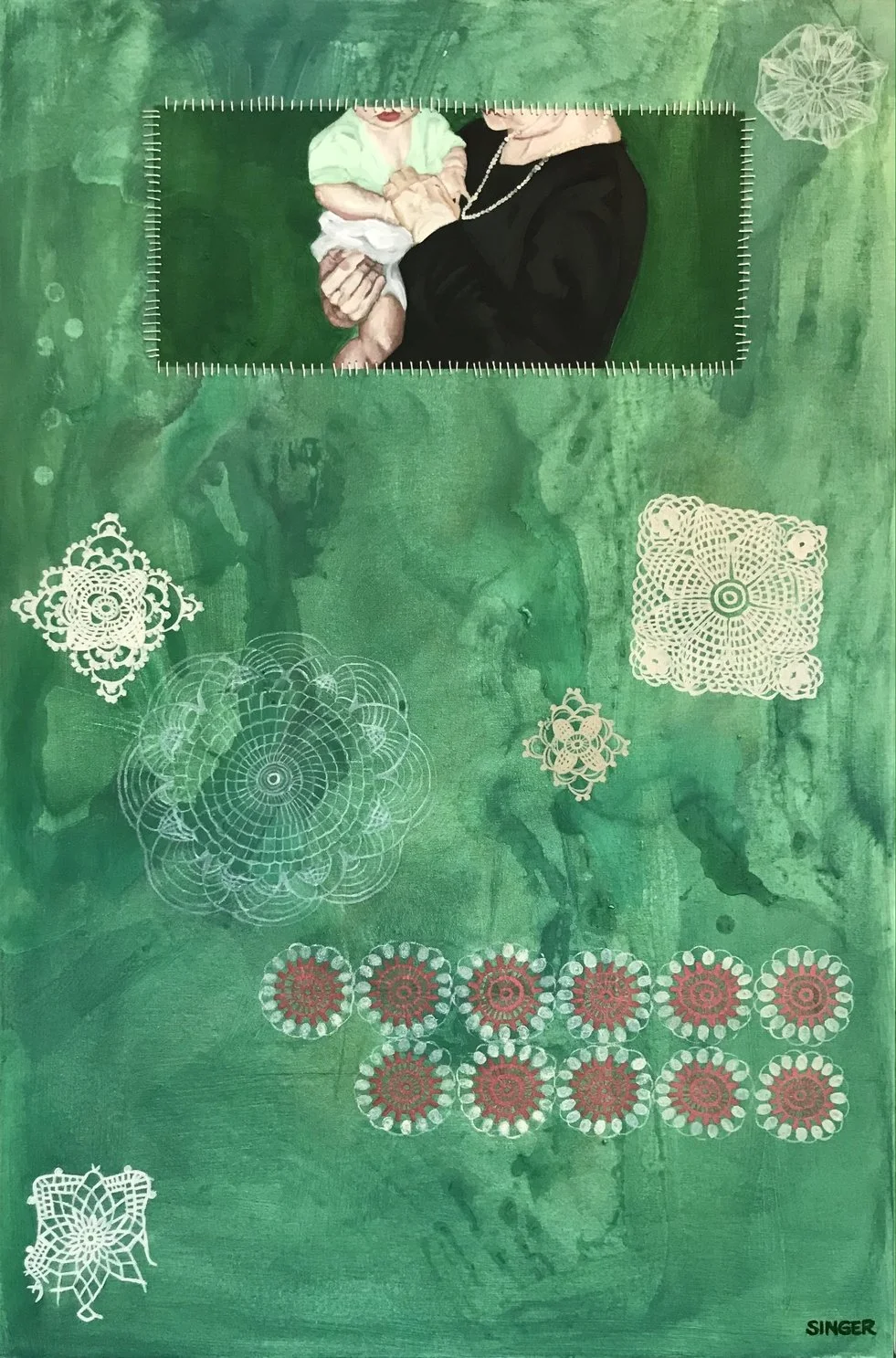 GENEVIEVE SINGER, 5, DOILY GARDEN, OIL AND ACRYLIC ON CANVAS, 24X36, 2021. Inspired by my grandmother who passed soon after I was born, who left behind a basket of doilies which I feel connected to due to their beauty and connotations of femininity, domesticity, tradition, and “low art”. My only memory of her occurs in her garden, which loosely dictates this composition.