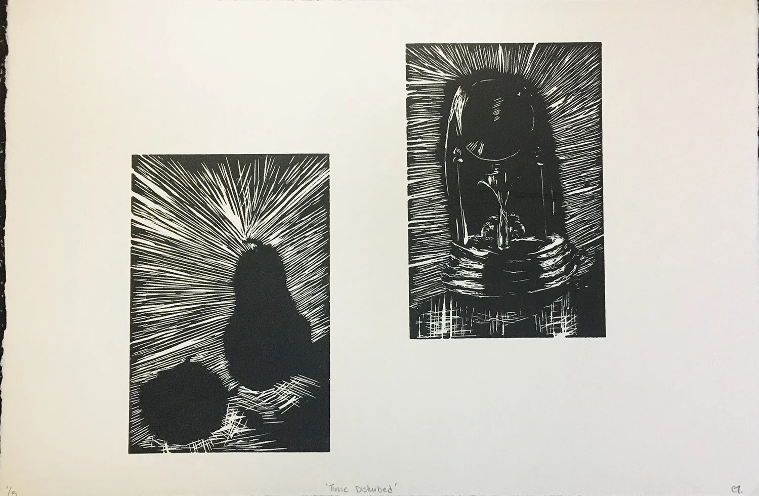CASSANDRA TREMBLAY, 4TH YEAR, TIME DISTURBED, LINOCUT, 22” X 15”, 2020 - A gestural, emotional linocut exploring the juxtaposition of stillness and movement in personal objects.