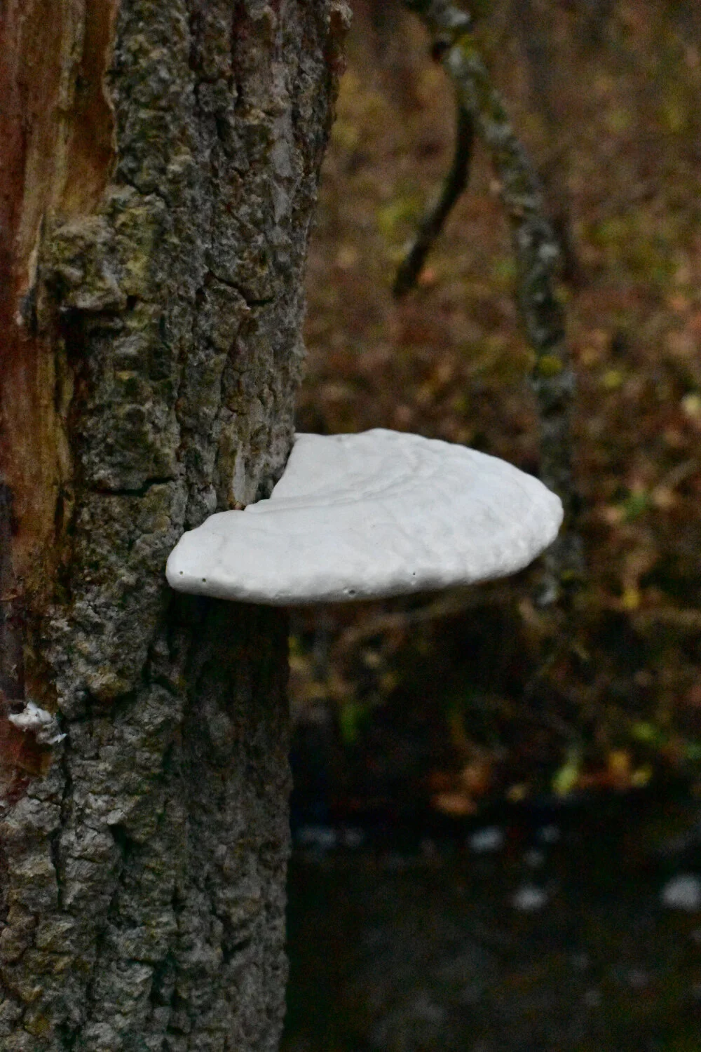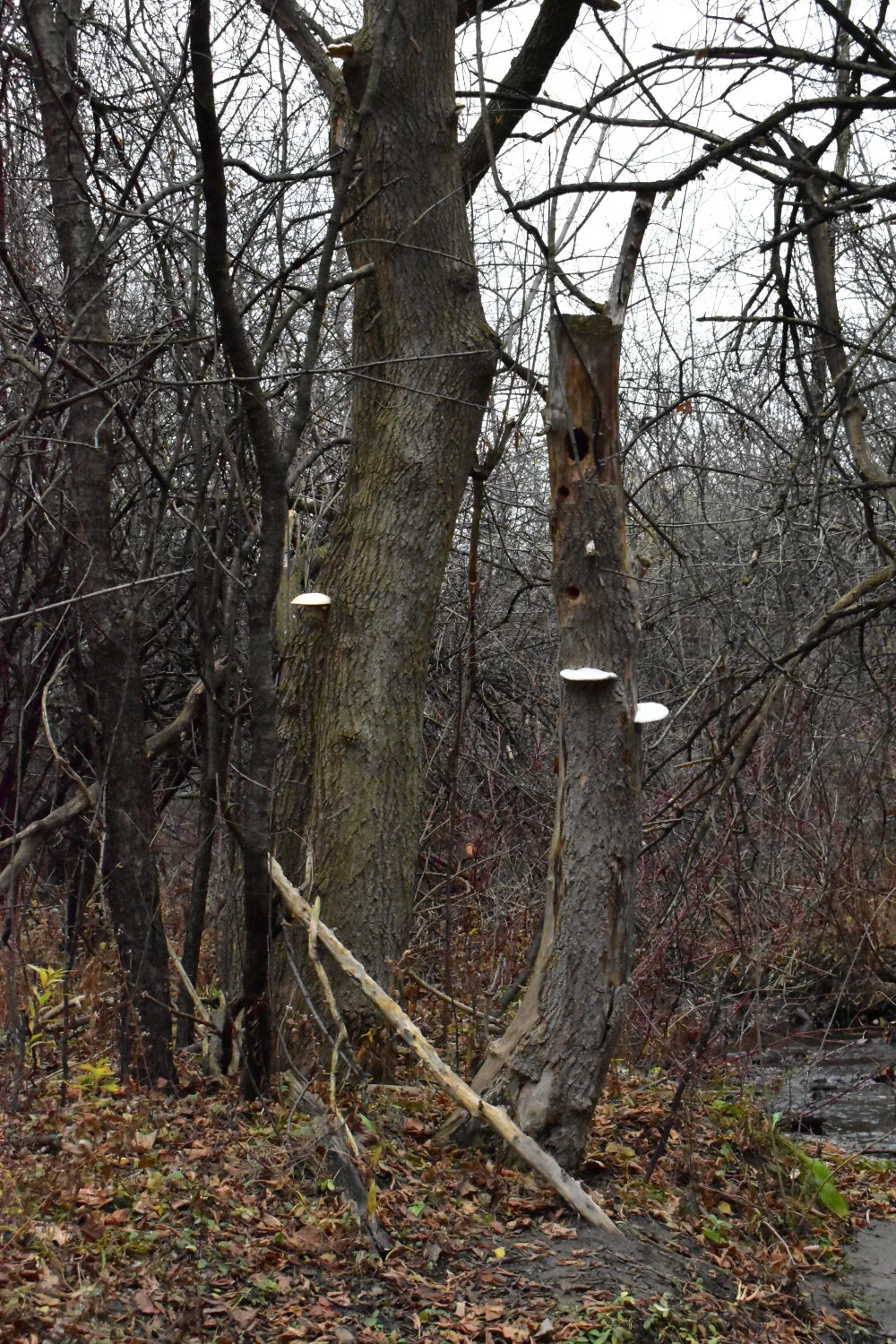 ASHA CABACA, 4th YEAR, PERPETUITY OF THE SHELF FUNGUS, PLASTER MULTIPLES ON DEAD TREES, 5.25” X 3.15” X 1.25” EACH, 2020 - An installation exploring the relationship between the man-made and natural. It relies on the viewer discovering the work, and through observation and interaction, realizing that these are not natural fungi, but man-made objects.