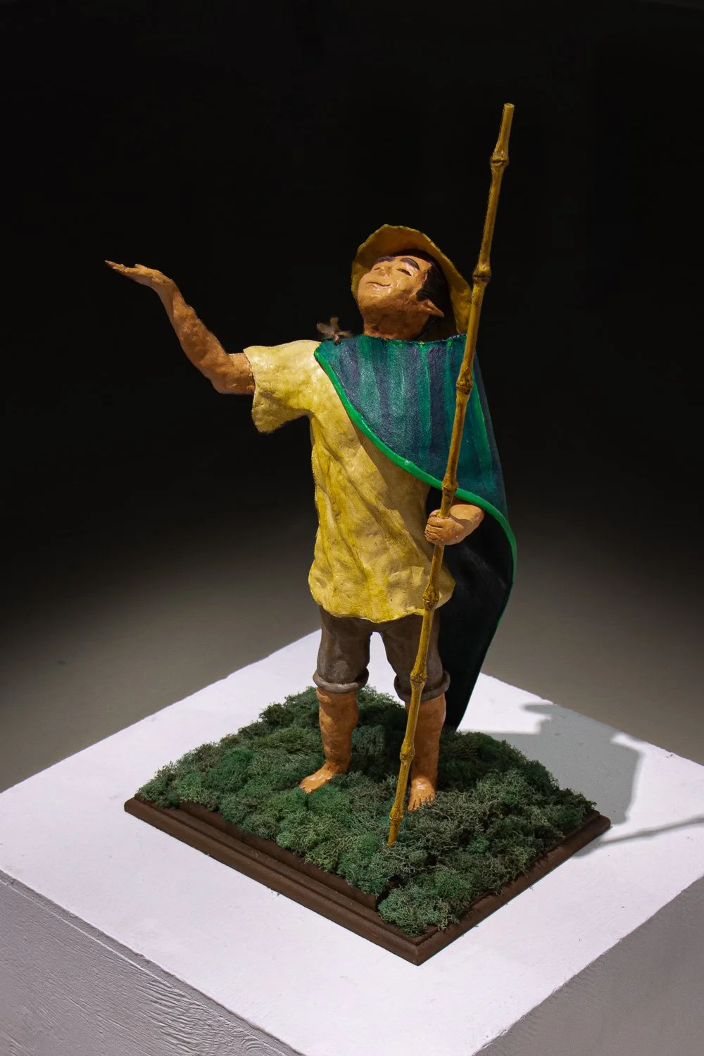 REVILL VILLANUEVA, 4, ANG MABAIT NA DUWENDE (THE KIND DWARF), CLAY AND WOOD, 19” X 12” X 9”, 2021. This is a self-portrait of the artist as a “duwende” (dwarf) that has traditional farmer outfit from the Philippines. The artwork explores the concept of how artist’s “seeds” help to encourage kindness and positive growth within the community for a better future.